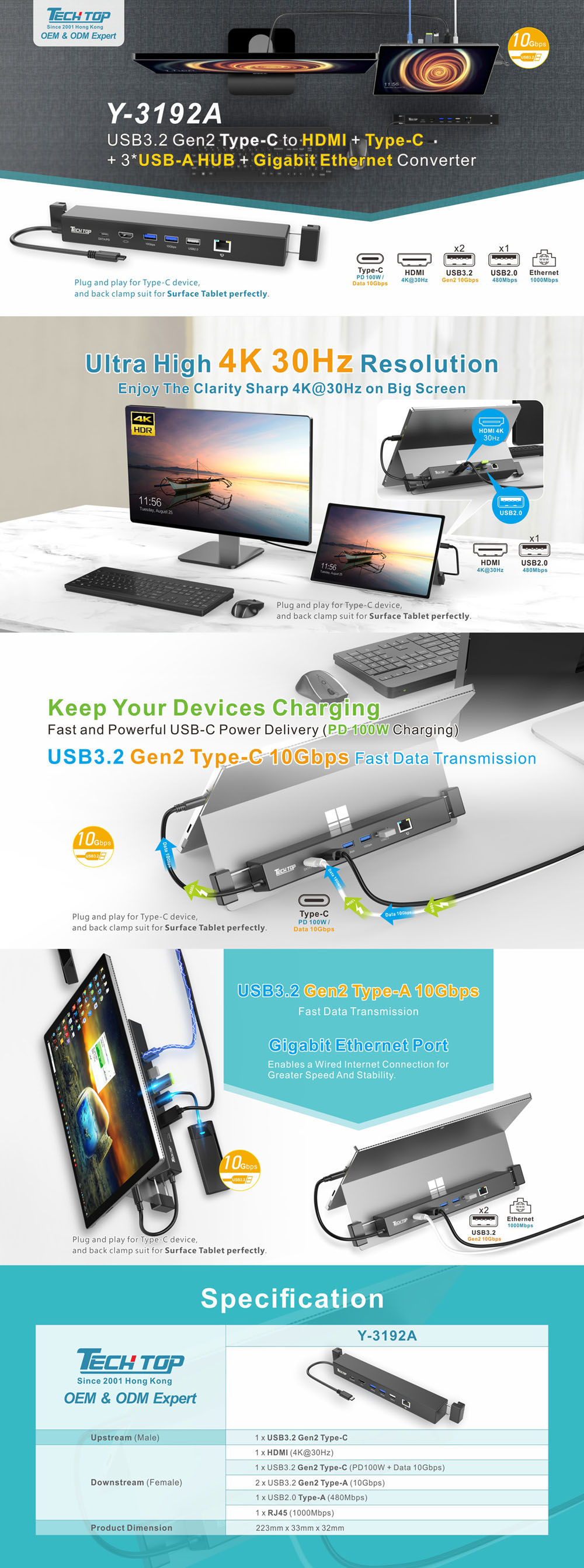 NEW:Y-3192A -- USB3.2 Gen2 10Gbps Type-c to HDMI + PD + USB3.2 10Gbps USB-A HUB + RJ45