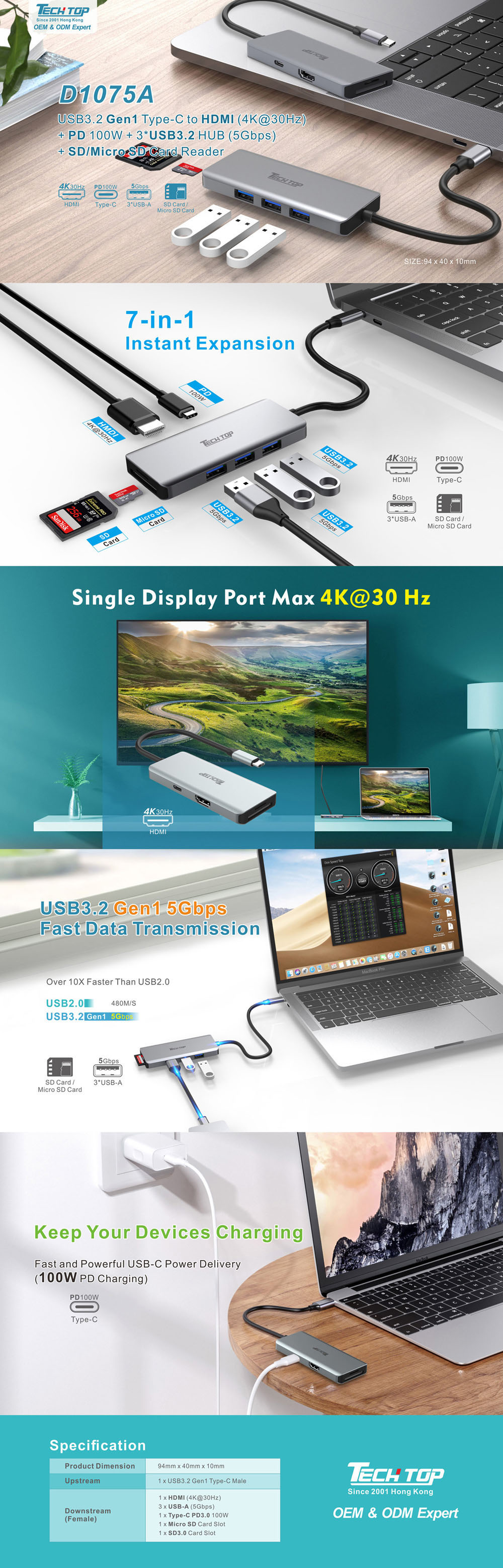 NEW D1075A: USB3.2 Gen1 Type-C to HDMI (4K@30Hz) + PD 100W + 3*USB3.2 HUB (5Gbps) + SD/Micro SD Card Reader