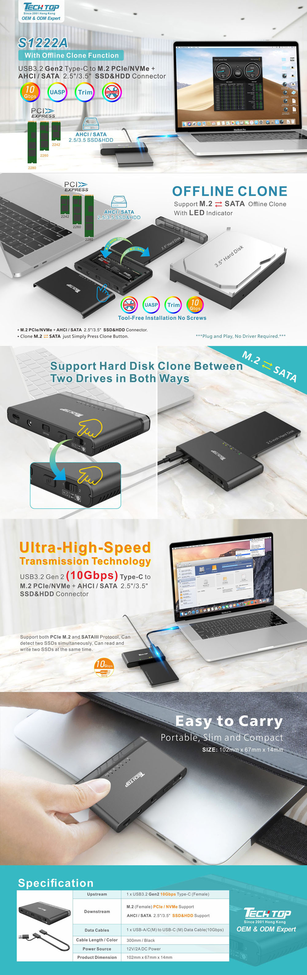 NEW S1222A: USB3.2 Gen2 Type-C to M.2 PCIe/NVMe + AHCI / SATA 2.5"/3.5" SSD&HDD Connector