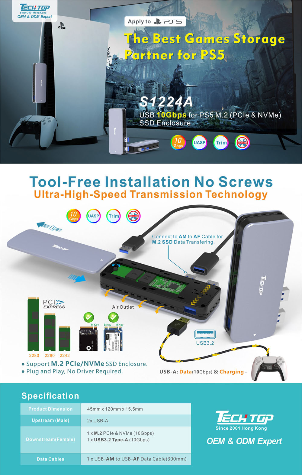 NEW S1224A: USB3.2 Gen2 10Gbps for PS5 M.2 (PCIe / NVMe) SSD Enclosure