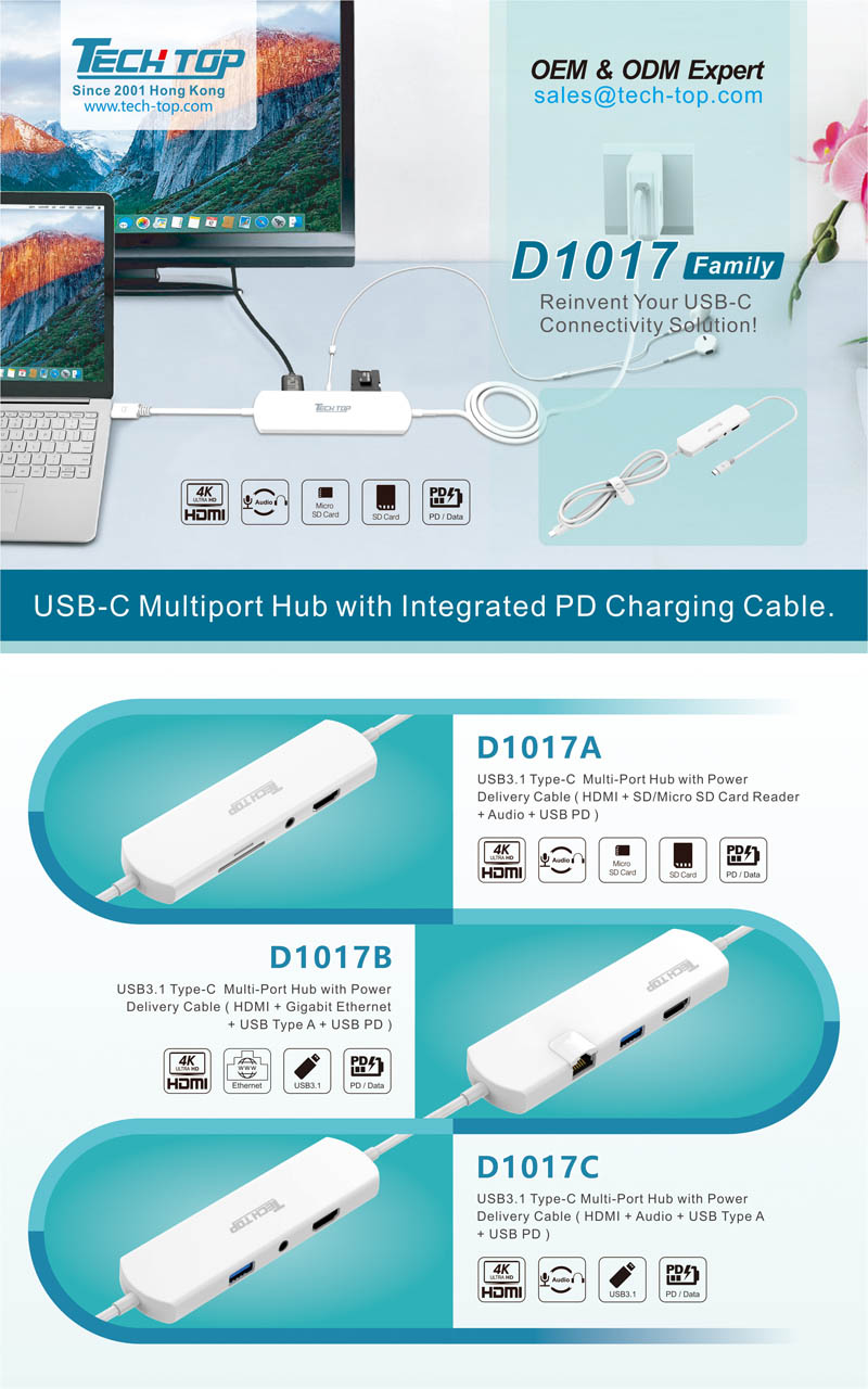 NEW:D1017 Series -- USB3.2 Gen1 Type-C Multi-Port Hub with Power Delivery Cable