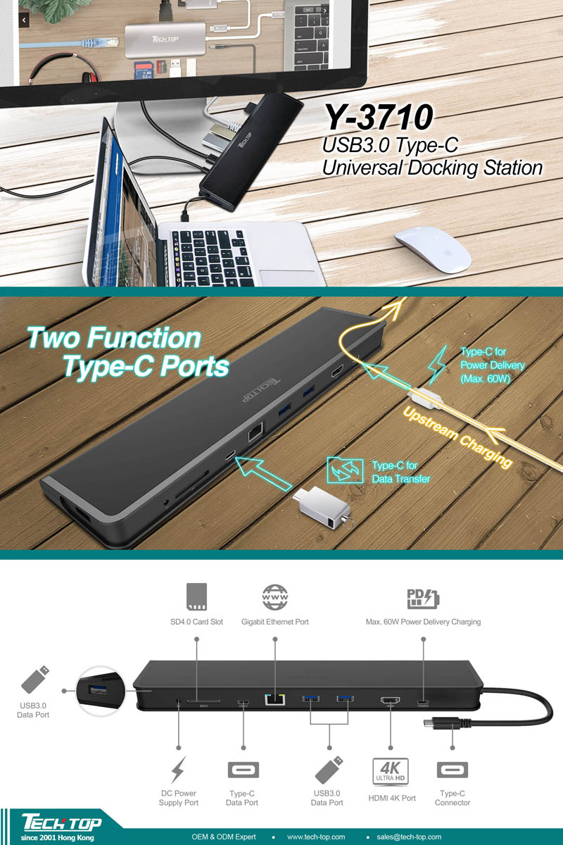 Here comes the most ideal choice and partner for your extra Notebook and Tablet with only one interface! Do not worry about that there is only one interface equipped with your notebook or tablet. Our latest Y-3710 could recover all the functions of your PC or Tablet, which is really a revolution! 3 Ports Type A hub extension allows you to connect different external devices with your PC or Tablet; RJ45 slot could solve your network anxiety; HDMI interface allows you to share the video graphic on another HD displayer; SD4.0 card reader function accelerates the unexpected read-write speed for you. The most importance is that this item is equipped with PD function, which will enhance the continuity of office work or entertainment and avoid the interruption due to Power! That is not all! DC PSU interface is the ideal standby function for charging your downstream devices! What a multiple-functional station! Come on! Seize this opportunity!