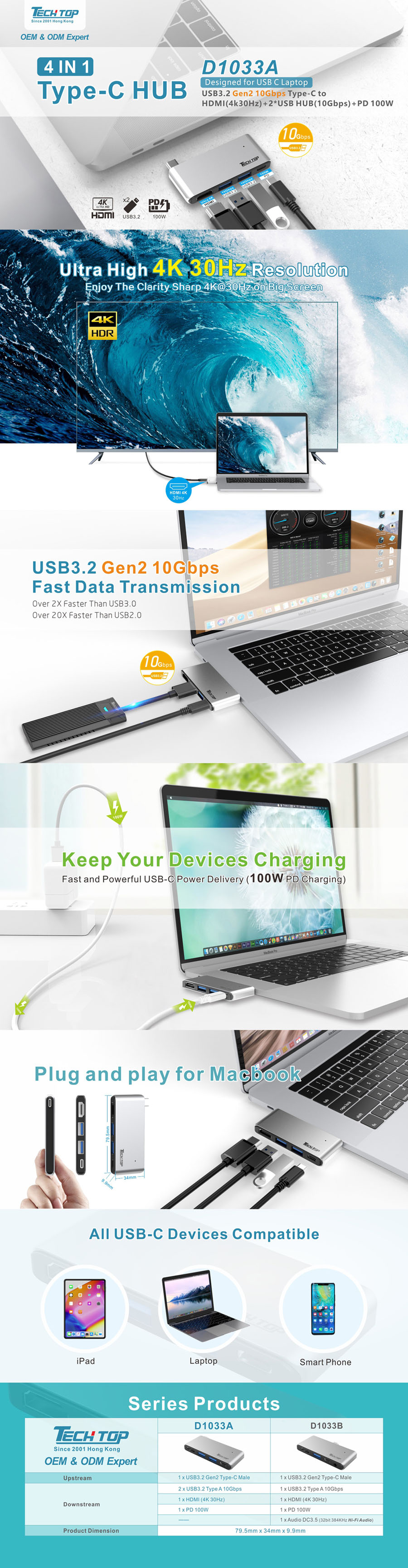 NEW:D1033A -- USB3.2 Gen 2 Type-C to HDMI(4K30Hz) + 2*USB-A HUB(10Gbps) + PD100W