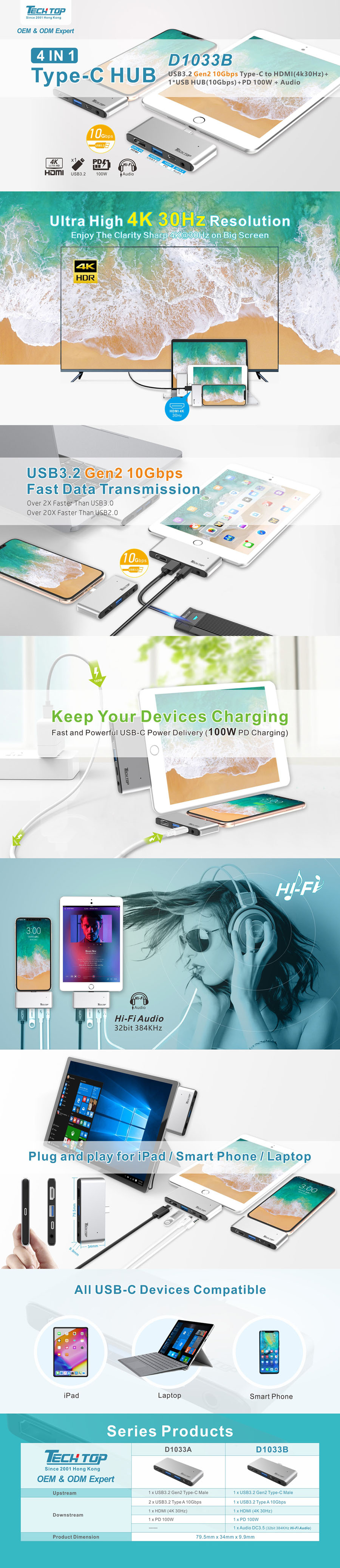 NEW:D1033B -- USB3.2 Gen 2 Type-C to HDMI(4K30Hz) + 1*USB-A HUB(10Gbps) + PD100W + Audio