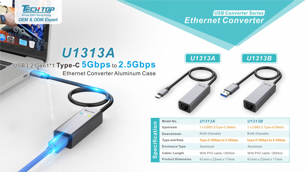 U1313B: USB3.2 Gen1 Type-A to 2.5Gbps Ethernet Converter, Aluminum Case
