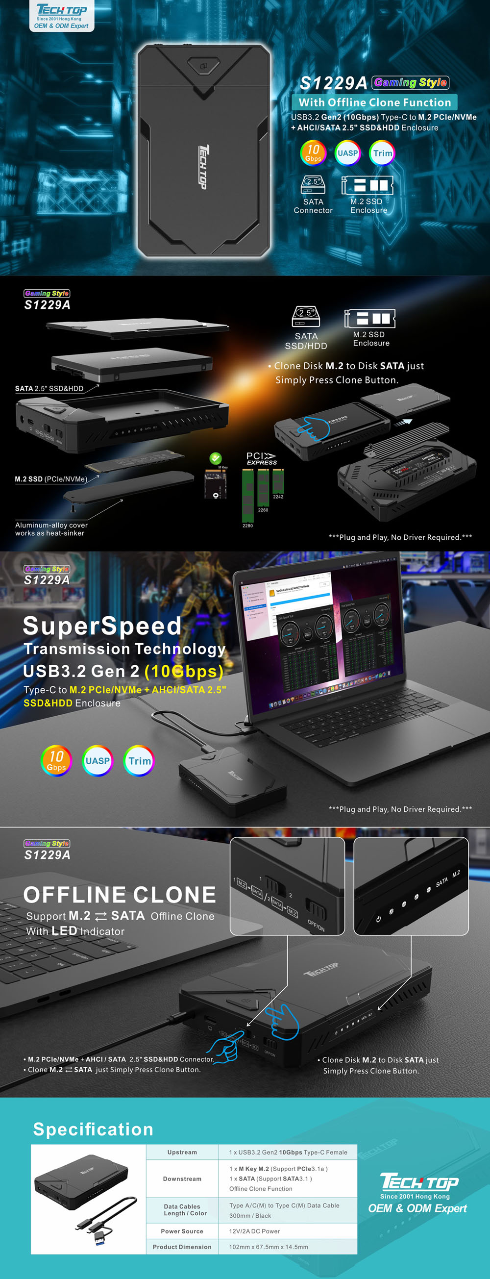 Performance: PCIe Gen3X2 NVME 1.3, SATA3.1, UASP, Trim, Simultaneous read/write, Offline clone