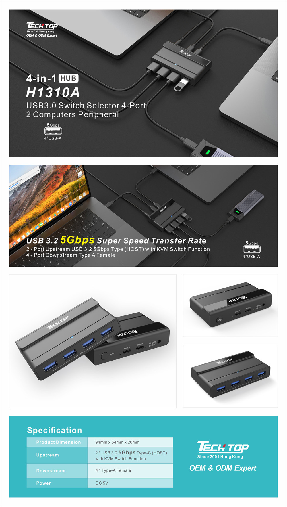 Upstream Port: 2x Type-C (USB 3.2 Gen 1, 5Gbps), Host switching function