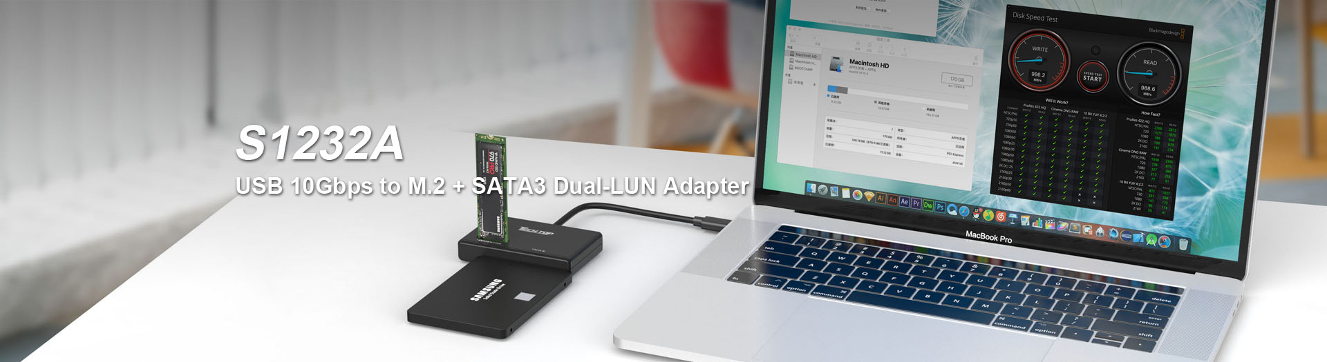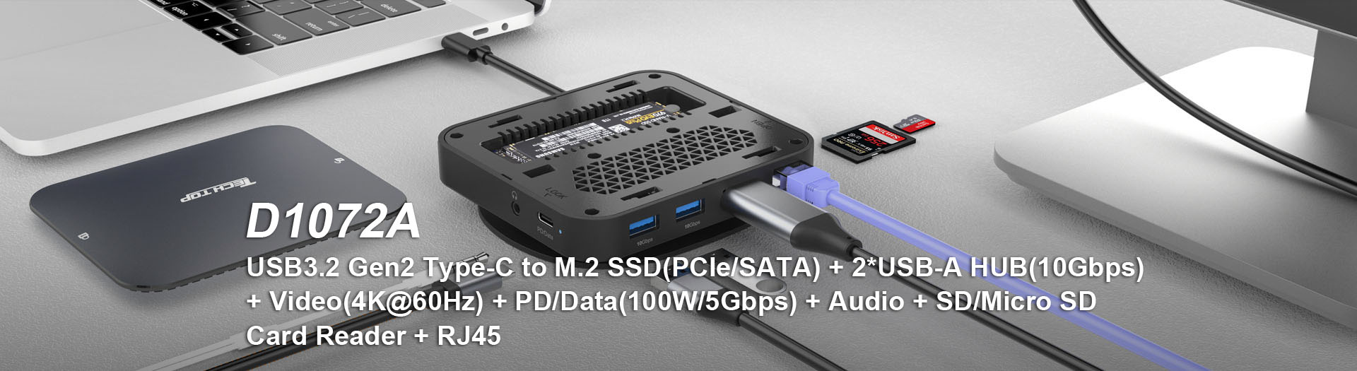 D1072A: USB3.2 Gen2 Type-C to M.2 SSD+2*USB-A HUB+Video+RJ45+SD/Micro SD Card Reader+Audio+PD/Data